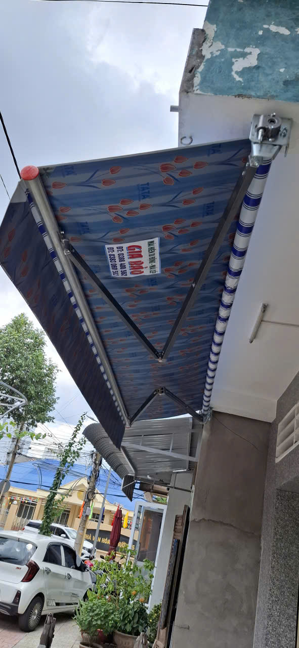 Mái hiên di động có thể kéo ra hoặc thu gọn tùy theo nhu cầu sử dụng.
